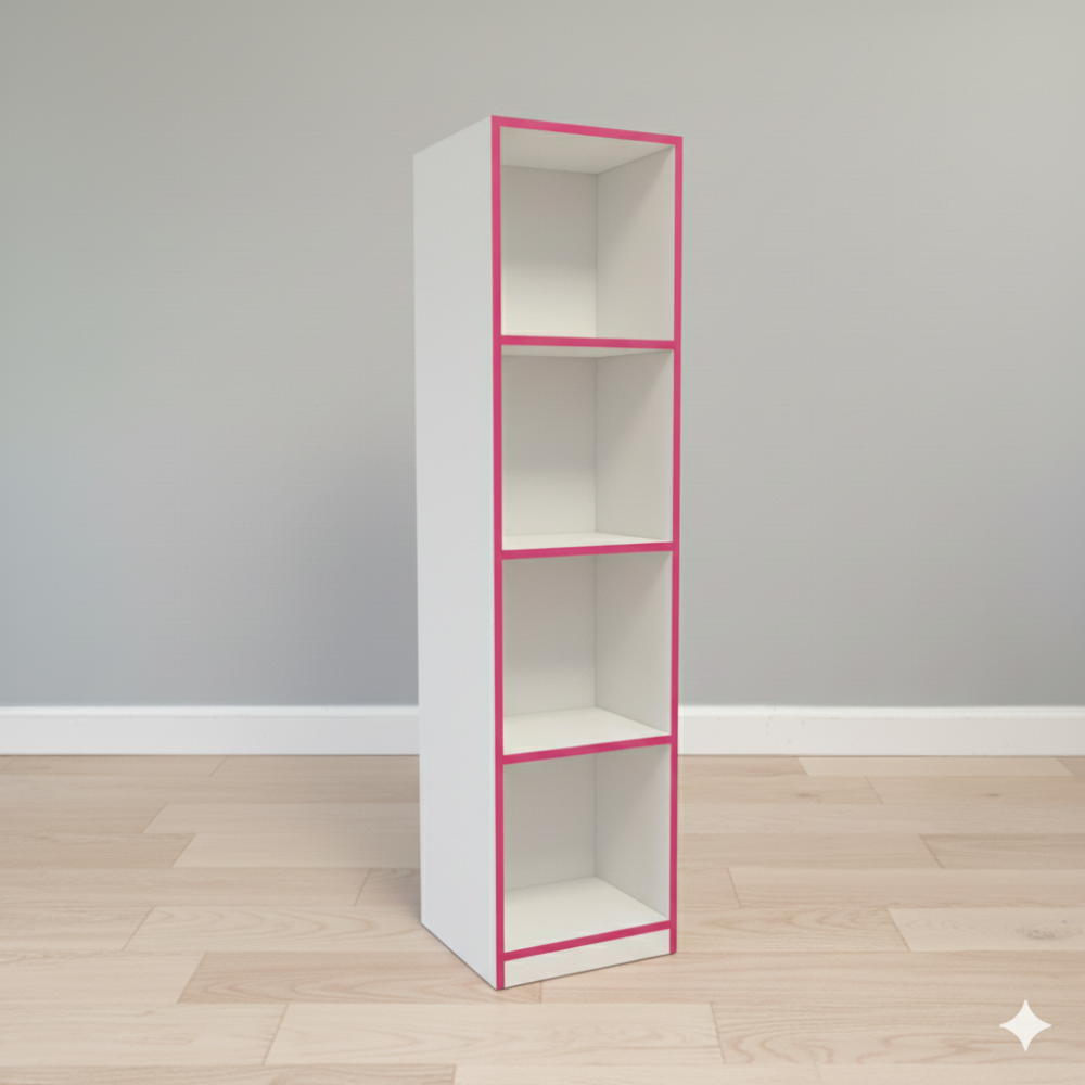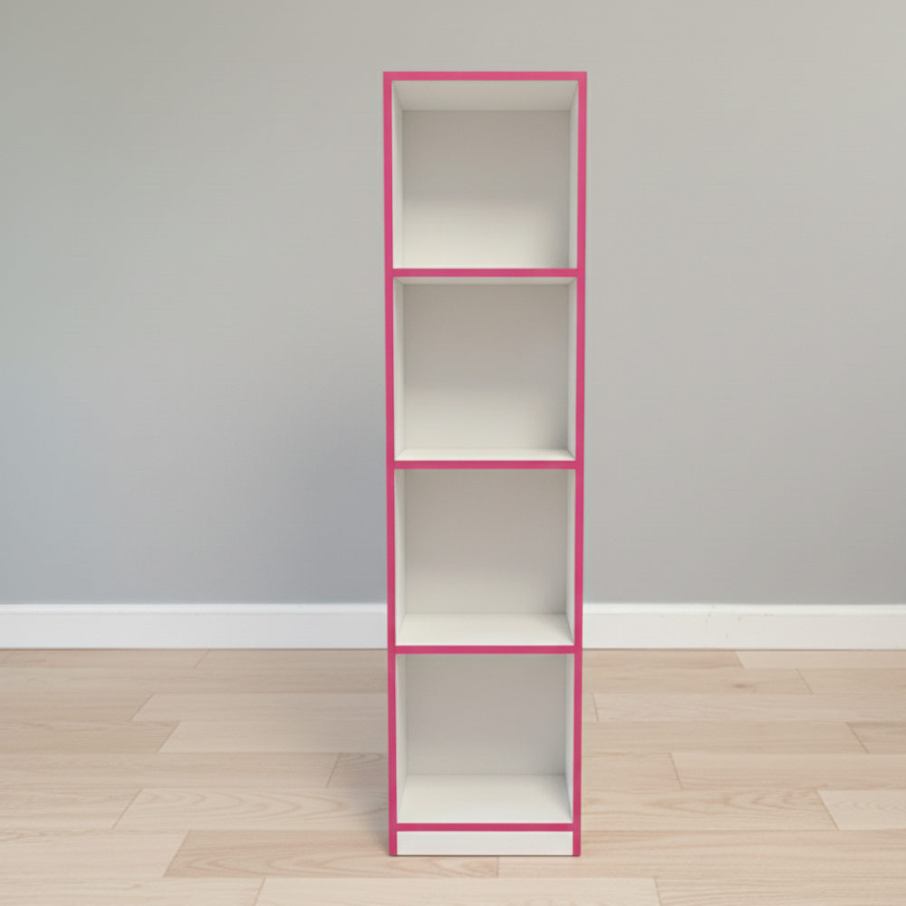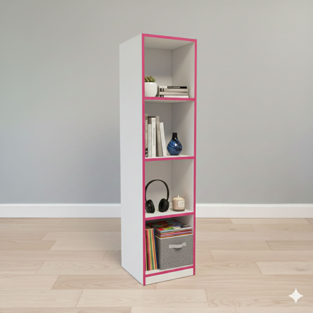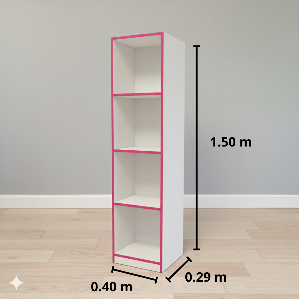 Sus cuatro compartimentos permiten organizar libros, decoraciones o archivos.