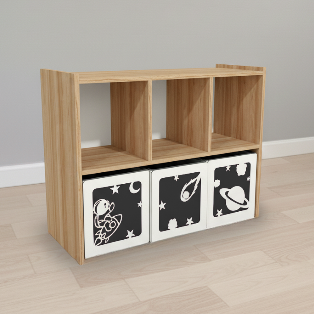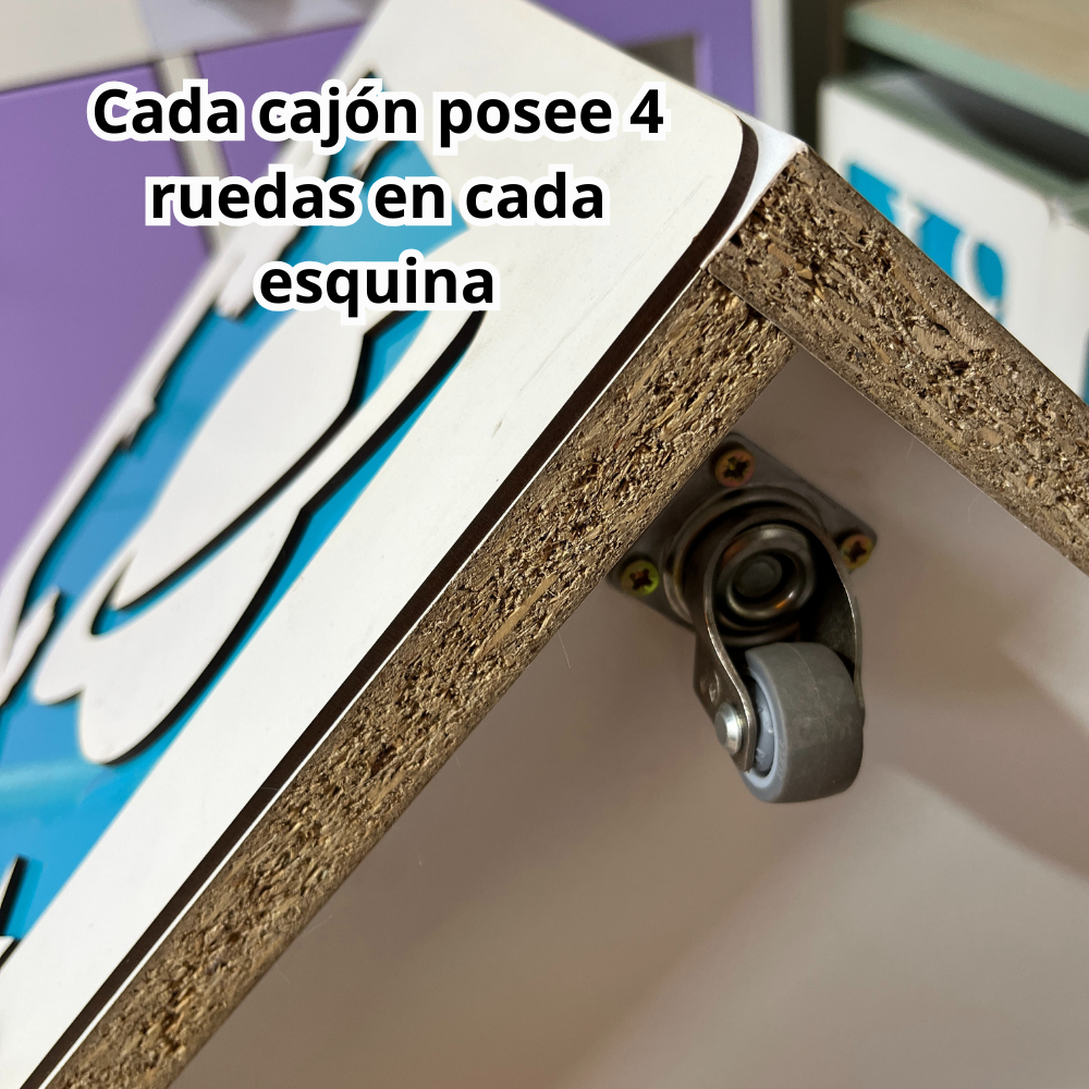 Diseñado para mantener el orden de forma práctica y segura, este juguetero cuenta con cajones extraíbles con ruedas que facilitan su uso por parte de los niños. Fabricado en melamina de 18 mm, ofrece resistencia, estabilidad y fácil limpieza.